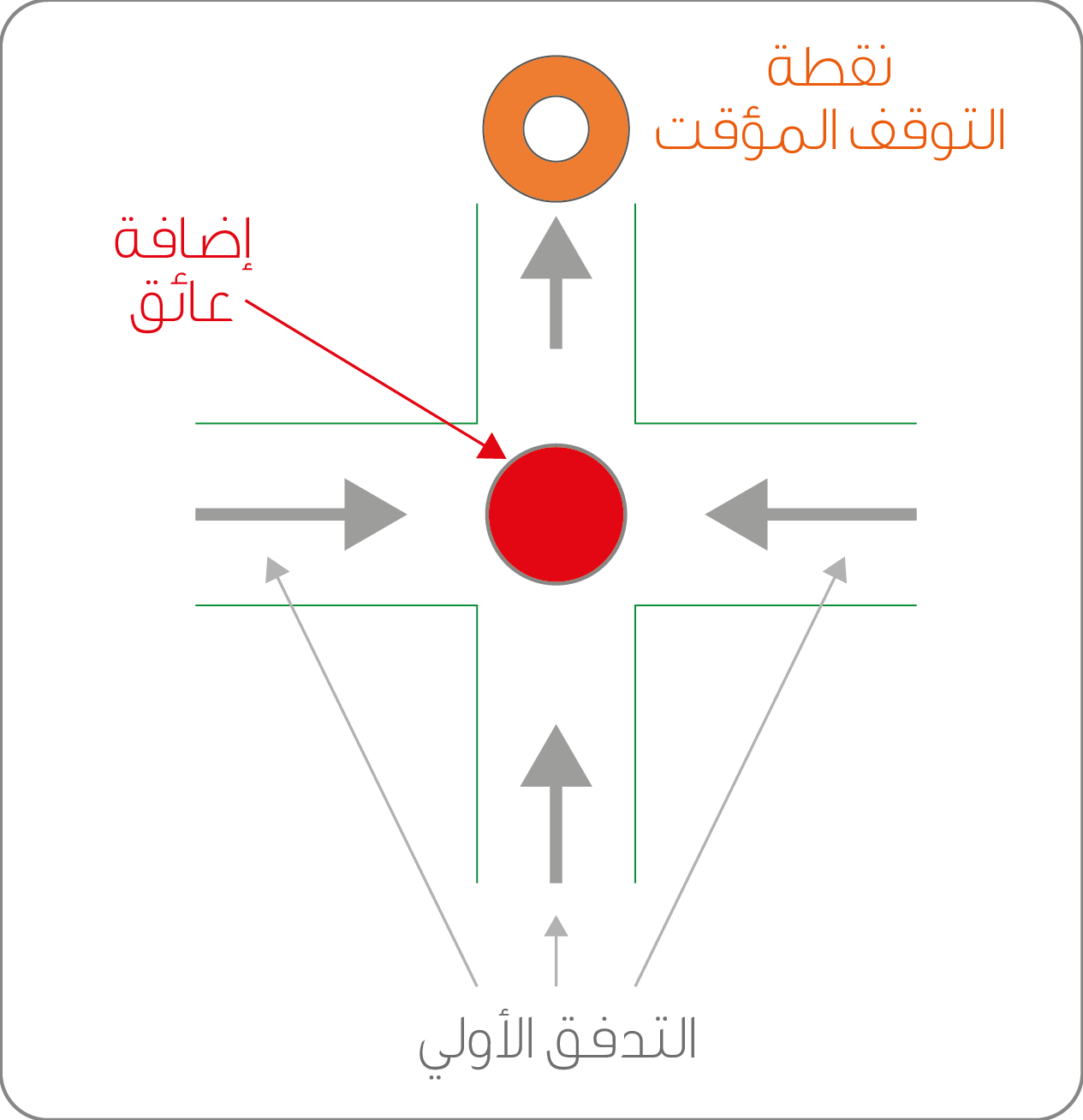 السيناريو الثاني هو سيناريو لبيان أثر الحل الأول على الحركة، وهو إضافة عائق في نقطة التقاطع لفرز حركة المشاة، أشبه بدوار للساحة ينظم حركة المشاة، فتكون التجربة على الشكل